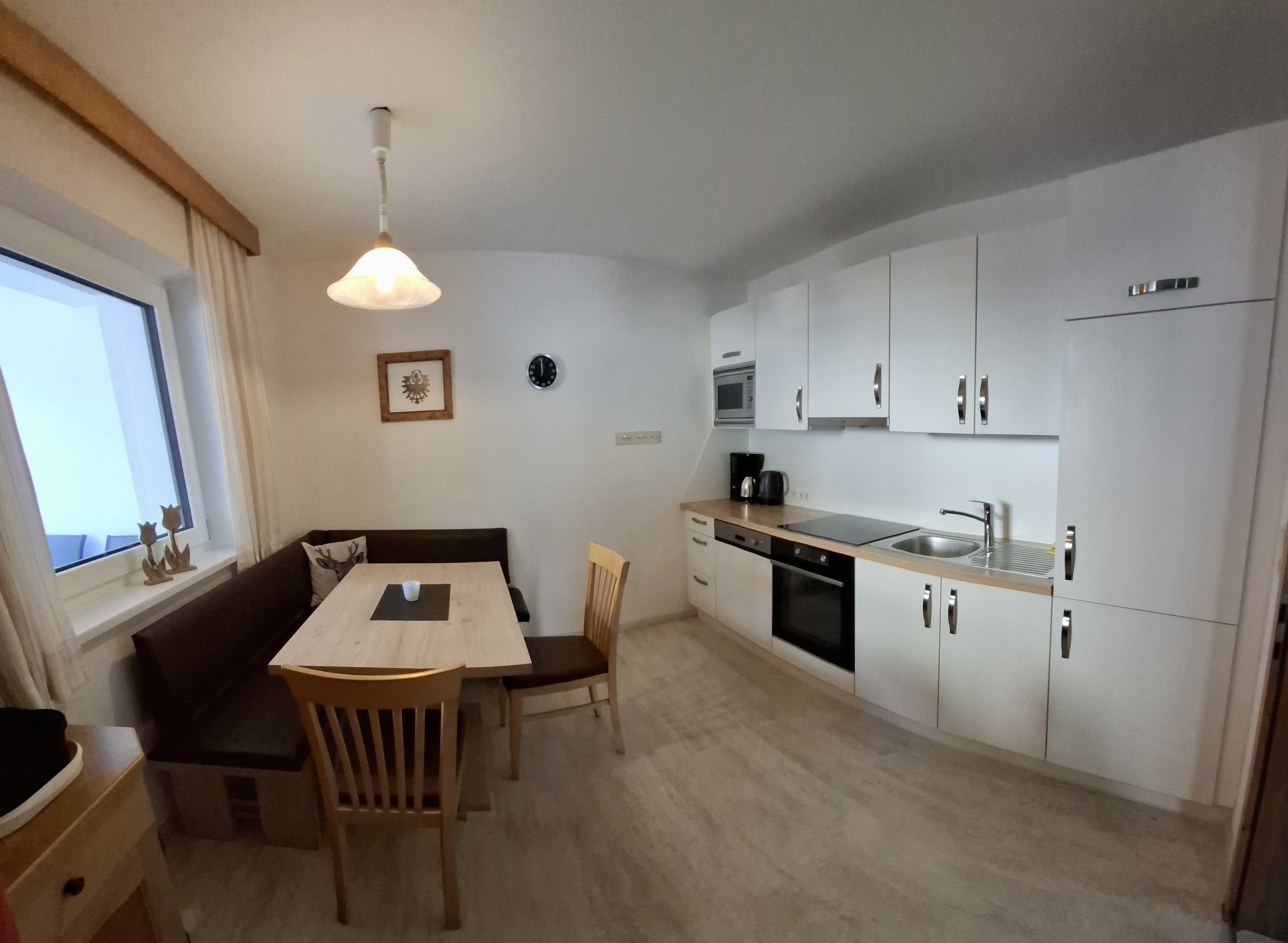 Eine geräumige Küche mit Esstisch und separatem Wohnzimmer.